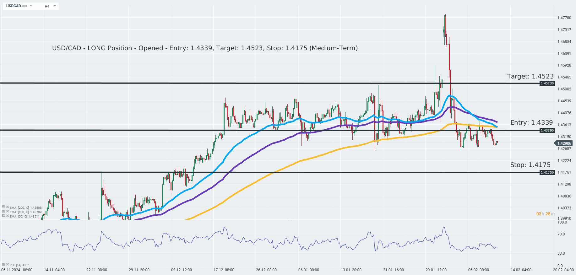 Credit Agricole recomienda tomar una posición larga en USDCAD al precio de mercado con un objetivo de 1,4523 y una orden de stop loss en 1,4175. Fuente: xStation 5