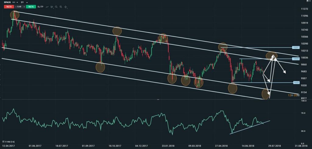 La semana pasada comentamos que “la zona donde hay que aprovechar para cerrar posiciones de compra a medio plazo es 10000-10200 ya que coincide con la banda superior del canal bajista de medio plazo.” De momento el precio continúa goteando a la baja dentro de su estructura negativa. Por abajo, hay dos niveles claves desde donde espero rebotes significativos: 1) la zona de mínimos de mayo y junio en torno a 9400 (donde aprovecharía para comprar con stops ceñidos) y por debajo 2) la banda inferior del canal en torno a 9000. Ambos niveles ofrecen buenos puntos para buscar compras y con independencia de cual sea el origen del rebote, si el precio llega a 10.000-10.200 cerraría las posiciones de compra ahí.