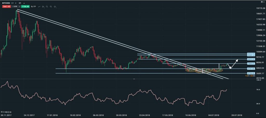 La semana pasada comentamos que “en el caso de que se rompiese la resistencia en 6822 se completaría una formación tipo h-c-h invertido y había que esperar impulsos hacia 7750/60” . Finalmente es el escenario que se ha producido. En este momento a corto plazo el precio se enfrenta a una primera zona de resistencia en torno a 7869. No hay divergencias ni estructuras negativas en el precio, por lo que pienso que seguiremos viendo desarrollos alcistas siempre y cuando no se rompa la zona de soporte en 6765/70. En el caso de que se generen procesos correctivos hacia 6770, aprovecharía para comprar un primer objetivo en 7869 y un segundo objetivo en 8800.