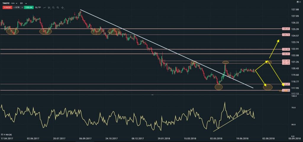 Muy pocos cambios esta última semana. La visión de medio plazo continúa siendo claramente bajista, por lo que aprovecharía rotaciones hacia 121.15/20 para abrir posiciones cortas con objetivo en 118.50, pero con stop ceñido por encima de 121.40, ya que una ruptura de esta zona activaría una formación de vuelta con un potencial objetivo en 124.00. Pese a que hay algunas señales de debilidad, (ruptura de directrices en RSI), de momento el precio se mantiene en un estrecho rango lateral.