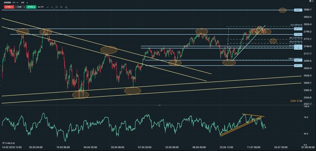 La semana pasada comentamos que “la tendencia era claramente alcista y por tanto, había que aprovechar correcciones hacia 2738/50 para volver a comprar. El objetivo para las próximas semanas es un re-testeo de los máximos históricos”. También hacíamos hincapié en las señales de debilidad aparecidas en forma de divergencia en indicadores como el RSI en 4h. De momento dichas divergencias han provocado tan solo una consolidación lateral. La zona 2785/90 es un soporte importante en el corto plazo ya que su pérdida podría confirmar una pequeña figura correctiva tipo h-c-h. En el caso de ocurrir aprovecharía caídas hacia 2755 para abrir posiciones de compra. Si por el contrario el precio cierra por encima de 2810/18 lo más probable es que veamos extensiones hacia máximos históricos sin que se produzca una corrección adicional.