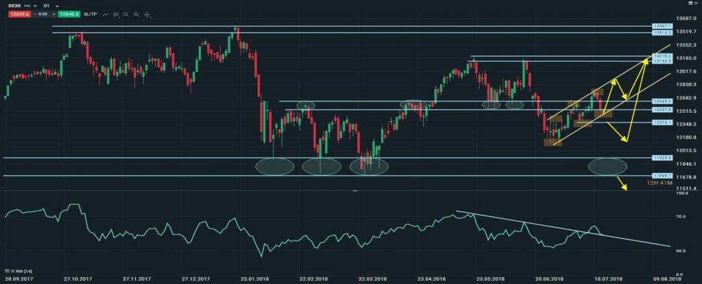 La semana pasada comentamos que “merecía la pena reducir las posiciones de compra en el entorno de 12650 porque era una resistencia fuerte y tanto el precio como el RSI no mostraban aun síntomas de extensiones adicionales al alza. Esperábamos una corrección que nos permitiese re-abrir posiciones de compra más cerca de 12100 con un objetivo posterior en 13150/13220.” Durante la última semana el precio consiguió dejar cierres por encima de 12650 y el RSI rompió su directriz bajista. Ambos son síntomas positivos que refuerzan la idea de que el DAX mantiene intacta su estructura alcista de medio plazo. Mientras el precio cotice por encima de 11700 solo me plantearía estrategias de compra, siendo la zona 12200 el nivel más seguro para que los traders de medio plazo abran sus largos. Para traders de corto plazo, se podría comprar ya, con stops por debajo de 12375 y objetivo en la parte alta del canal (12875).