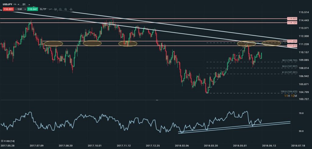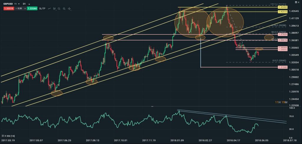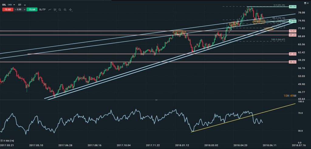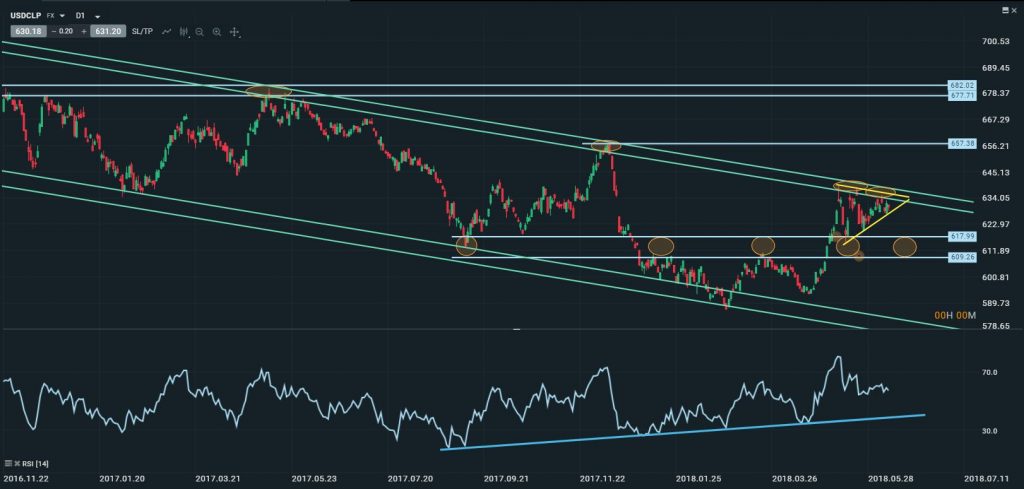 El precio se está acercando de nuevo a la banda superior del canal bajista. Dada la crisis en las monedas emergentes, existe cada vez más riesgo de que se rompa el canal bajista al alza. Además, desde hace algunas semanas estamos viendo como la consolidación lateral reciente podría estar formando una estructura triangular. Por este motivo, si el precio cierra por encima de 640 daría una señal alcista clara y habría que esperar extensiones como mínimo hasta 657.