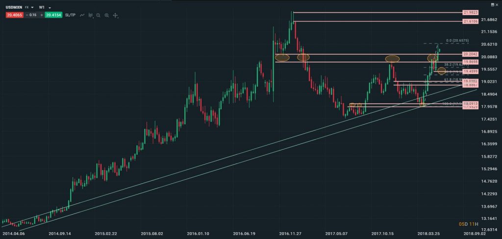 Finalmente el mercado ha roto la resistencia crítica en 20.20. Aunque no era el escenario que considerábamos más probable, la semana pasada advertíamos de las implicaciones alcistas que tendría la superación de este techo. La crisis en las divisas emergentes (real, peso argentino, rupia indonesia, rupia india, lira turca, etc), se ha convertido en uno de los focos de tensión más importantes para los inversores recientemente, y estamos viendo como se extiende hacia otros países como México. A medio plazo el escenario más probable es un nuevo ataque a la zona de máximos en 21.60/22.00. Dada la verticalidad de la subida, puede haber correcciones tácticas. Si se produjera una hacia 19.40/50 aprovecharía para comprar.