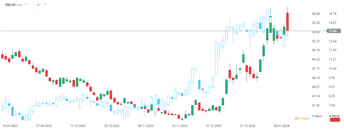 Zim (ZIM.US), compañía que tuvimos oportunidad de analizar desde XTB y que puedes volver a leer aquí, se dispara en el pre-mercado como consecuencia de los ataques de ayer en la costa de Yemen a un barco estadounidense. Como ya analizamos, este tipo de compañías repercuten el aumento de los costes a sus tarifas.