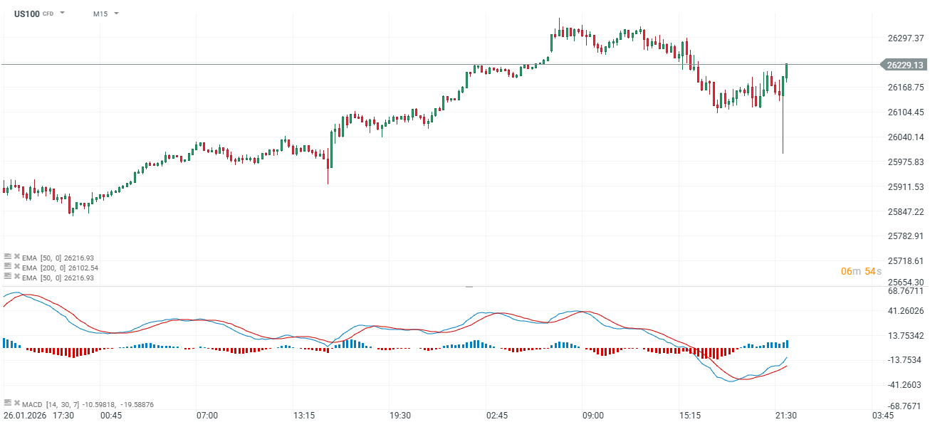 U.S. technology companies reported their Q4 2025 results after the Wall Street close today. Most companies (Tesla didn't) beat consensus estimates on both earnings and revenue, supporting the US100, which recovered losses following Powell’s remarks. After the releases, Meta Platforms and Tesla are up more than 4%, Microsoft is down nearly 3%, and IBM is up almost 7%.