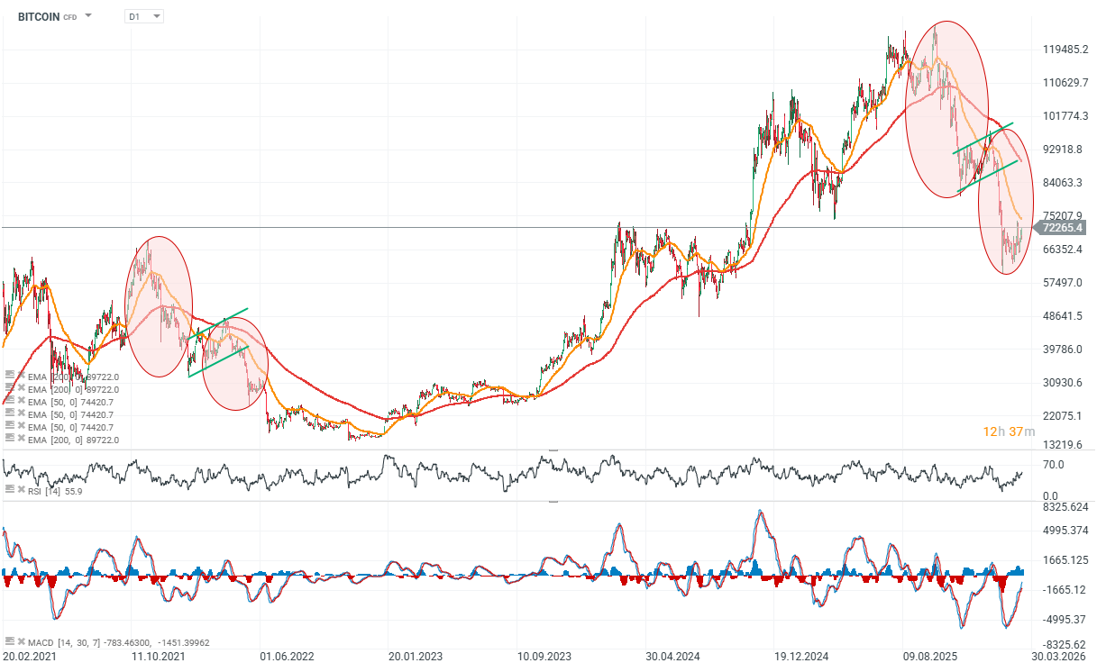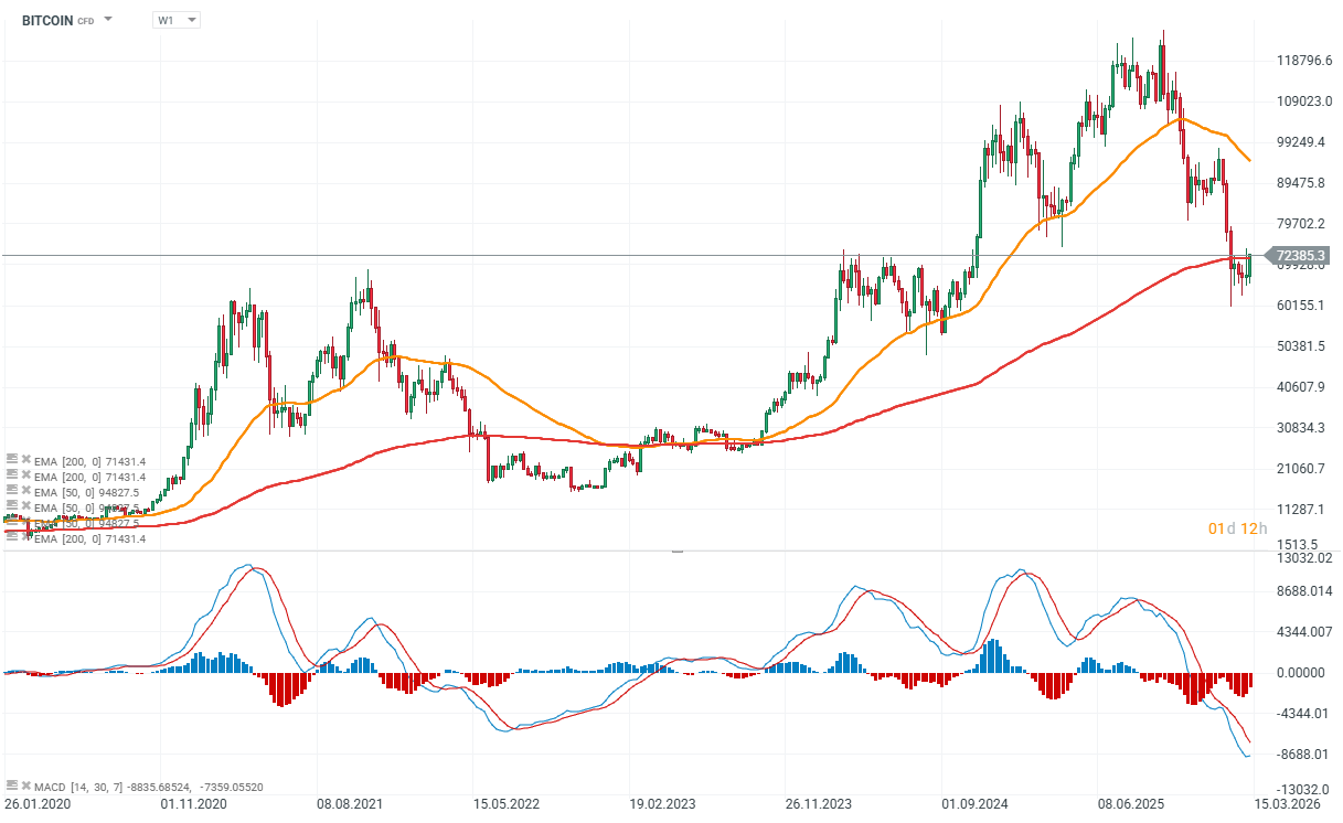 Interestingly, in 2022 Bitcoin eventually plunged below the EMA200 (red line), triggering the final wave of panic selling. Currently, the price is trading exactly at the weekly EMA200 (red line). If a decline were to start from these levels and be percentage-wise similar to the drop in autumn 2022, we could expect a 40–50% decline, potentially toward the $35,000–$40,000 range.