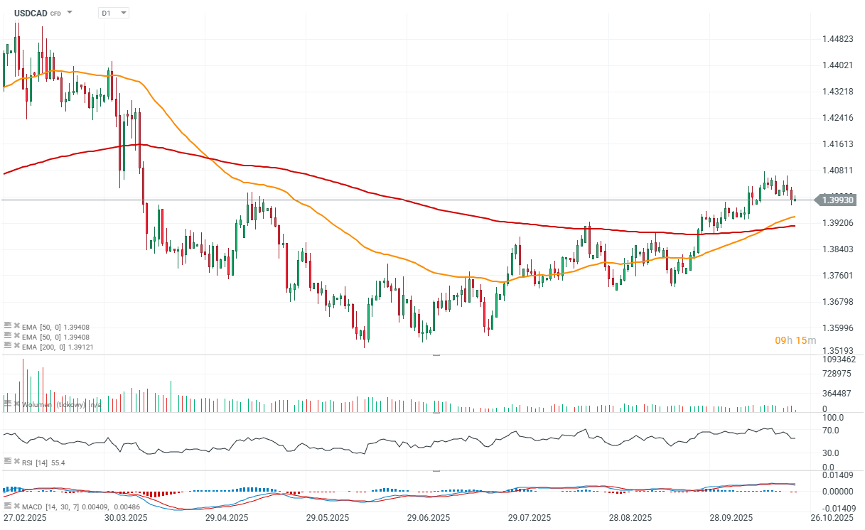 It is also worth noting that inflation in Canada rebounded sharply to 2.4% year over year in September, compared with 1.9% in August. The probability of another BoC rate cut (scheduled on the same day as the Federal Reserve’s decision) currently stands at around 80%. The USDCAD pair remains below the 1.40 level, showing a slight decline after the report. Meanwhile, the strengthening of oil prices suggests that USDCAD could experience a short-term correction toward the 1.3900–1.3950 range.