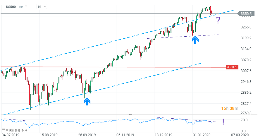 Risky assets choke yesterday in the later afternoon and a volatile mood is being observed today in the morning as well as there are signs that coronavirus spreads beyond China. Indeed Japan and South Korea, where we saw death cases, introduced more limitations that could affect business activity. Meanwhile, China informed about a 92% decline in car sales in the first half of February. US500 is declining for the second day as it tests an upper limit of a previous channel – now as a support. Traders should notice a negative divergence with the oscillator.