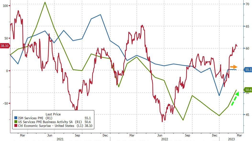 Both services indexes returned to the expansion area last month. Source: Bloomberg via ZeroHedge