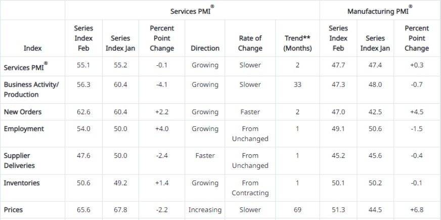 The ISM Services PMI for the US fell to 55.1 in February from 55.2 in the previous month, above analysts’ expectations of 54.5.