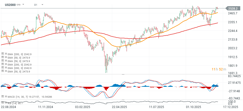 The index is one of the key indicators of the U.S. economy, as small businesses in the United States employ nearly 50% of all workers. The improvement in sentiment largely stems from interest rate cuts and expectations of lower rates in 2026. Futures on the Russell 2000 (US2000) which groups smaller U.S. companies (though still too large to report to the NFIB) are trading near their historical highs.