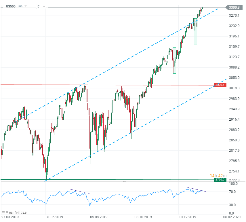 US and China signed the PhaseOne trade deal yesterday and while there is a lot of skepticism in comments, US markets move relentlessly higher and US500 has just broken 3300 for the first time ever. Technically, a divergence with a 14-days RSI could be a warning but we are yet to see any bearish candle formations. Traders will await a quarterly report from Morgan Stanley and US data on retail sales later today.
