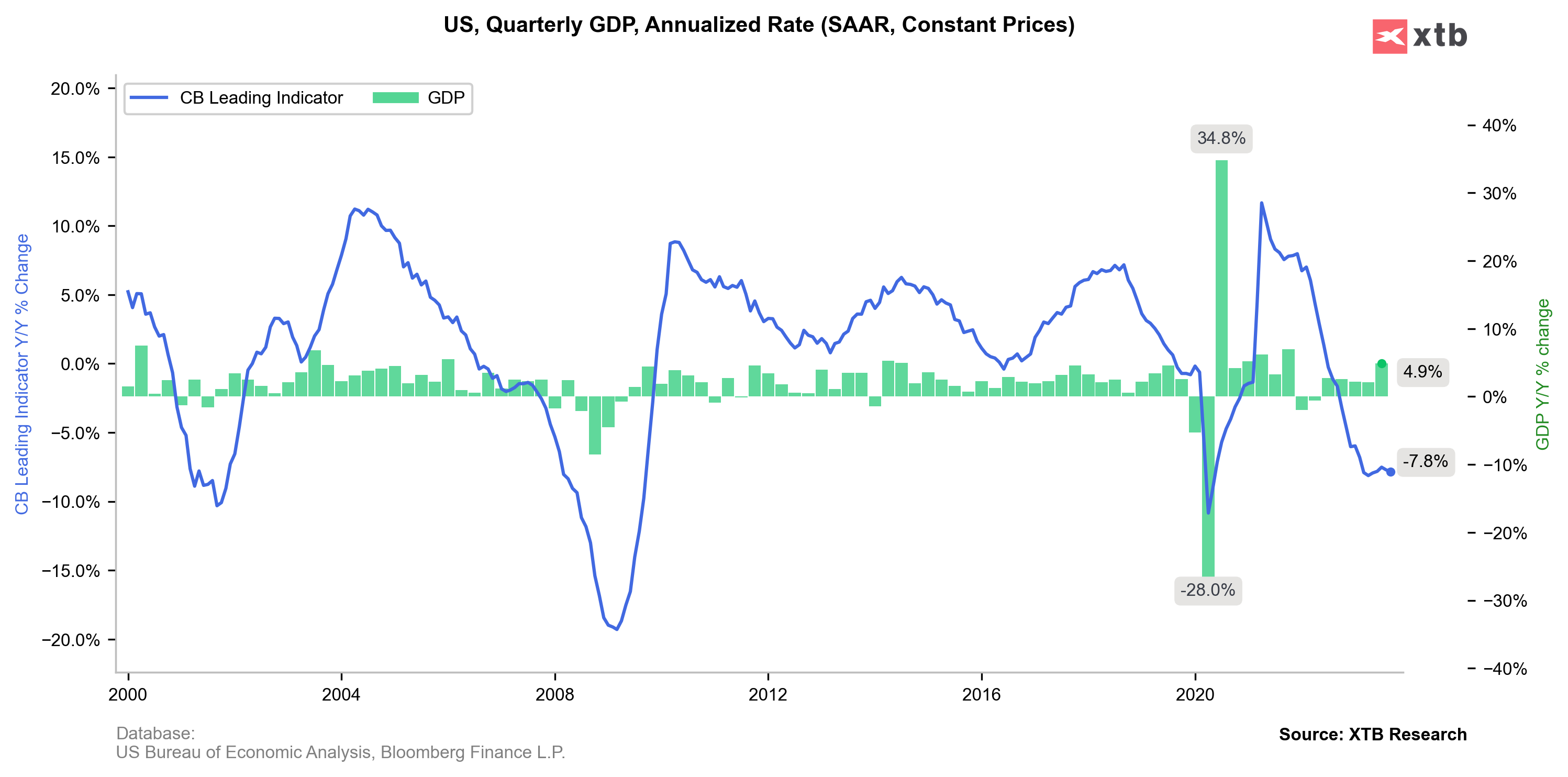 A key US macro report of the week - GDP report for Q3 2023 - has been just released at 1:30 pm BST. Report was expected to show a significant acceleration in annualized GDP growth compared to Q2 2023. Apart from GDP data, a weekly report on jobless claims as well as durable goods orders report for September was released simultaneously.