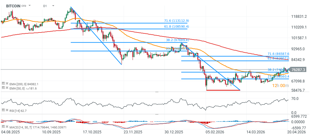 The move above $76,000 has raised hopes that the uptrend may continue, with Bitcoin potentially testing the $82,000–$83,000 range, where the EMA200 (red line) is located—a level that has shifted from support to resistance and has not been broken since October 2025. On the downside, a drop below the EMA50 (orange line), around $75,000, could signal a return to a bearish trend and profit-taking, with a possible stronger downward move toward the $60,000 level.