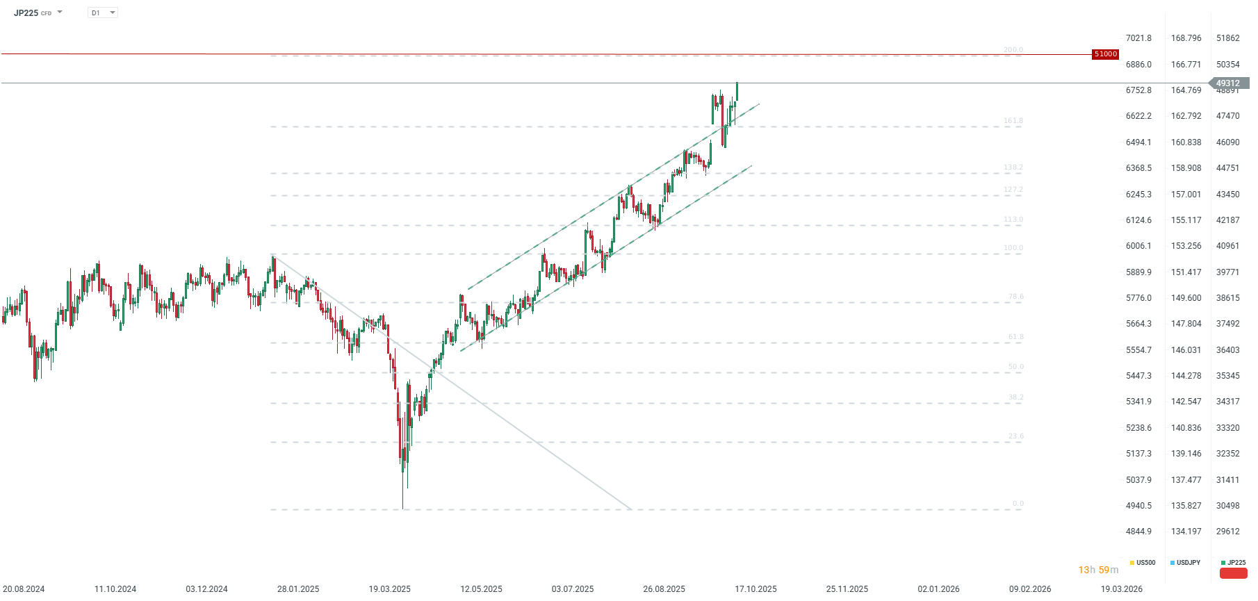 The Japanese Nikkei 225 cash index is up more than 3% today, surpassing 49000 points and setting another historical record, following a previous high established earlier in October. The move is a direct response to hopes of ending the political deadlock in Japan. The broader Topix Index also recorded gains of 2%, primarily motivated by the electronics and financial sectors.