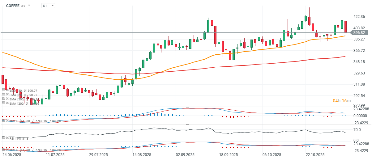 Arabica coffee prices decline today maintaining high volatility since early October. The market remains supported by tight global supply — coffee inventories keep falling, while rainfall in Brazil’s key arabica region (Minas Gerais) remains below average.
