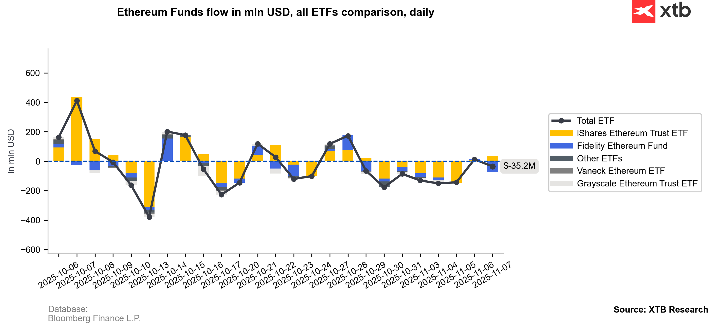 Cryptocurrencies attempt a rebound on Monday after sharp declines, during which BTC fell about 20% from its all-time high, while Ethereum pulled back to around $3,000 from $4,900 seen in the summer. Today, both of the largest cryptocurrencies are gaining along with U.S. stock indices, where improving sentiment may signal higher inflows into ETF funds. Hopes for a U.S. government reopening have increased, as Republicans continue to negotiate details with Democrats. Importantly, reopening the government would also boost market liquidity, which—beyond improved sentiment about the economy—could serve as a more structural driver for the trend.