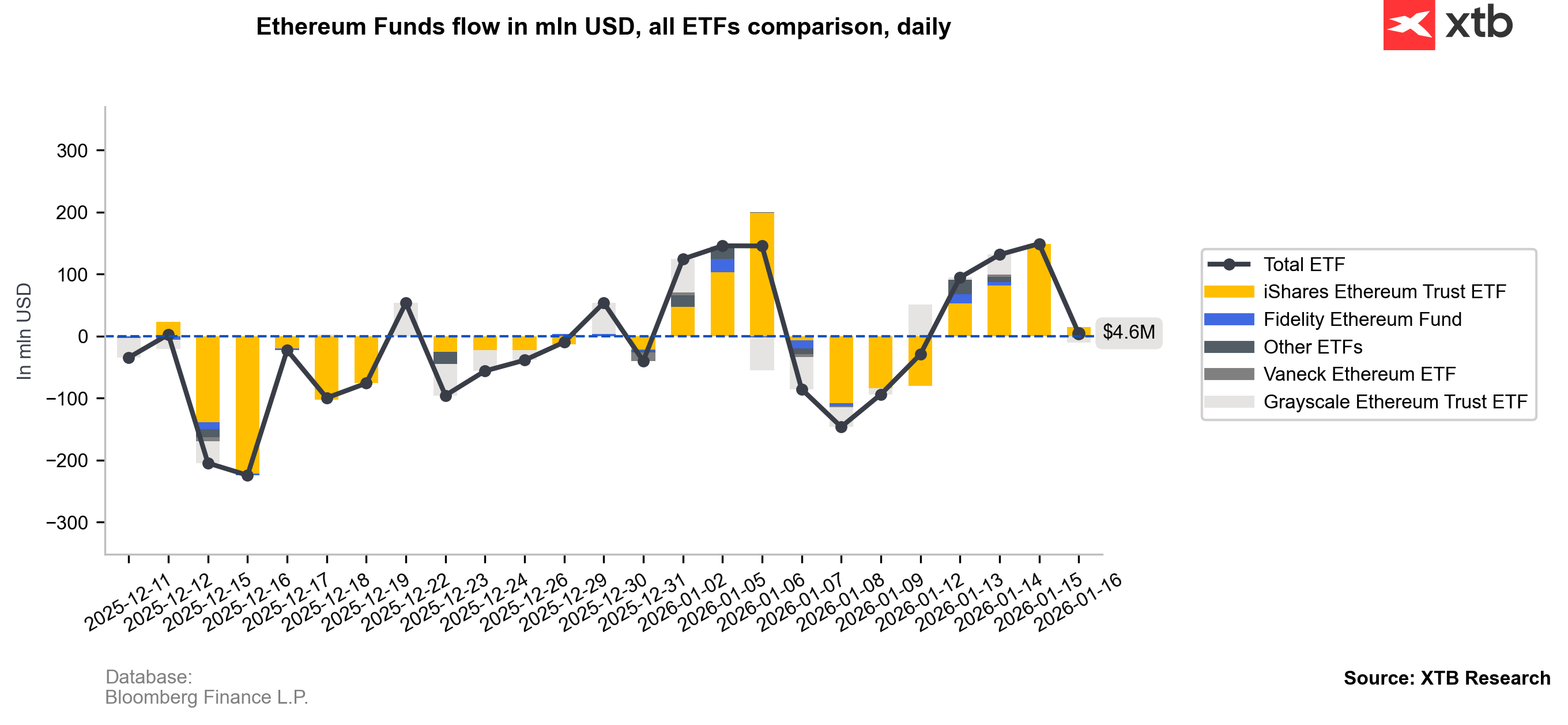 Over the last 30 days, net flows into Ethereum have been clearly negative, and Friday brought just under $4 million in positive net inflows. Overall ETF trading volumes for ETH have fallen noticeably compared with the autumn, reinforcing the uncertainty around the next leg of the trend.