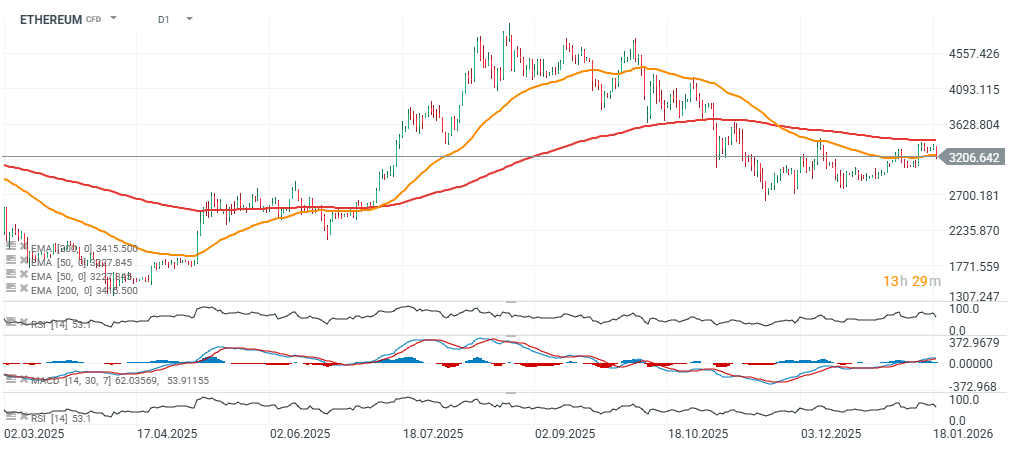Ethereum has recently struggled to break through a key resistance level represented by the 200-session moving average on the daily timeframe (EMA200). At the moment, it appears that the area around $3,400 is what separates ETH from a broader bull market. The main support level is the psychological $3,000 zone, while buyers should keep the price above the EMA50 ($3,200) if momentum is to hold.