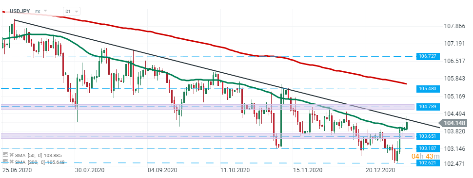 USDJPY – pair managed to break above the 50 SMA (green line) during today’s session and is currently testing long-term downward trendline. Should a break above the trendline occur, upward move towards local resistance 104.78 at may accelerate. On the other hand If sellers manage to halt advances here, the downward move into 103.65 is possible. Source: xStation5