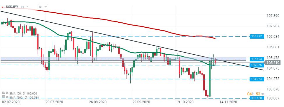 US indices are trading in mixed moods, with Dow Jones and the S&P 500 fell 0.5% and 0.27% respectively, while the Nasdaq rose slightly. The pandemic situation continues to worsen and it seems that after initial optimism investors weighed the timeline of the mass roll-out of an effective vaccine. The number of new cases in the US surged above 100,000 for an eighth consecutive day. Yesterday country reported record number of 142 906 new cases, which is the highest number since the pandemic began. The steadily increasing number of infections has forced several regions, including New York, to introduce further restrictions. The number of hospitalizations also reached record level of 65,368, the second consecutive daily record, and fatalities reached their highest since May. On the data front, CPI figures came in below market expectations in October, while weekly jobless claims fell to a seven-month low last week, but remained well above pre-pandemic levels. On the corporate front, Walt Disney and Cisco Systems will report their quarterly figures after the market close.