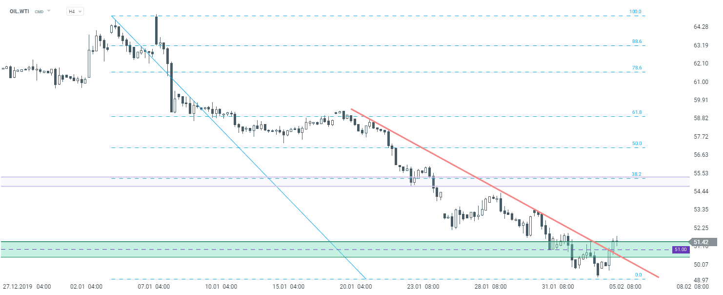 Oil prices are up almost 4% today. Possible coronavirus treatment and alleged OPEC news may have had an impact. Source: xStation5