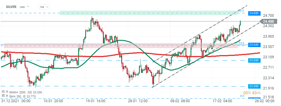 Silver price rose over 11% since the beginning of February as precious metals in general tend to perform well during times of geopolitical turmoil. Today silver also recorded strong gains and if current sentiment prevails upward move may accelerate towards major resistance at $24.80, which coincides with 38.2% Fibonacci retracement and upper limit of the ascending channel. Source: xStation5
