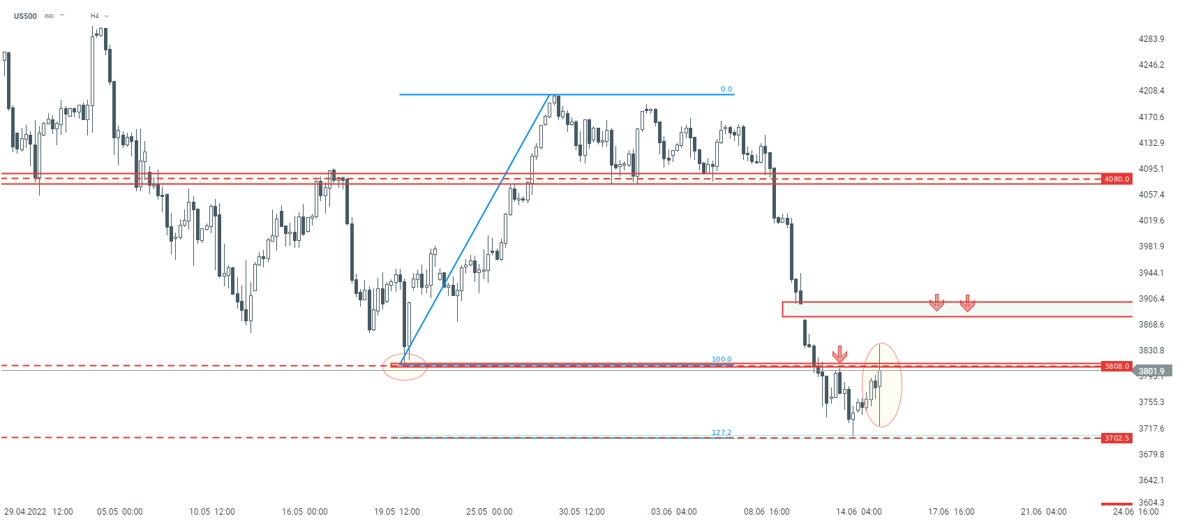 After today's Fed decision, we could observe a positive reaction of major Wall Street indices. US500 defended the support at 3702.5 pts, which coincides with 127.2% external Fibonacci retracement and next buyers managed to above the resistance at 3808 pts. Source: xStation5