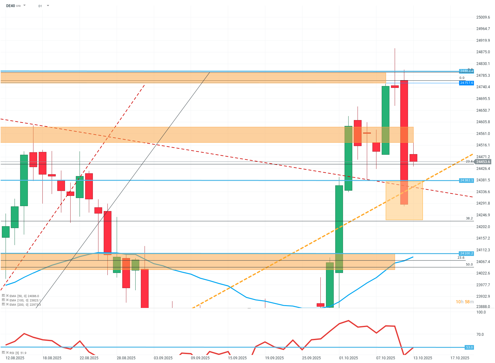 The chart shows that after bouncing off the levels of the last ATH, the index temporarily fell below the medium- and long-term trend lines (orange and red). However, a quick breakout above them confirmed their technical significance. Currently, the quotations are in the area of the FIBO 23.6% retracement of the last upward wave - which constitutes a key point of resistance/support. To maintain a positive scenario, it is necessary to defend the resistance around 24380 points, as its breach could initiate a correction towards 24100 points. The RSI indicator remains in the moderate valuation zone, suggesting neutral sentiment.