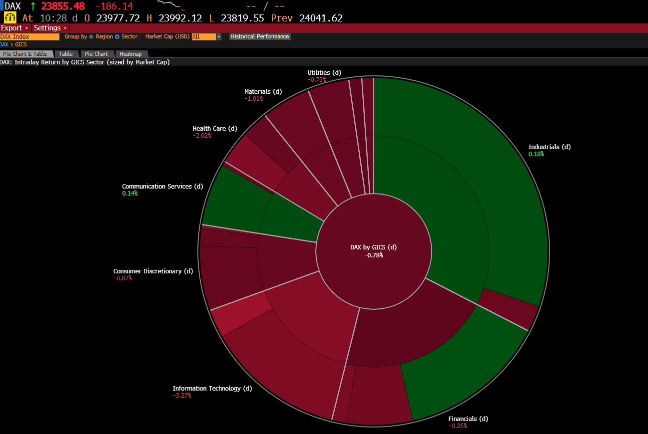 The market is under broad pressure. On the DAX index, the biggest declines are seen in technology and pharmaceutical companies. They are followed by retailers, services, and distributors. Industrial companies are currently on a slight positive.