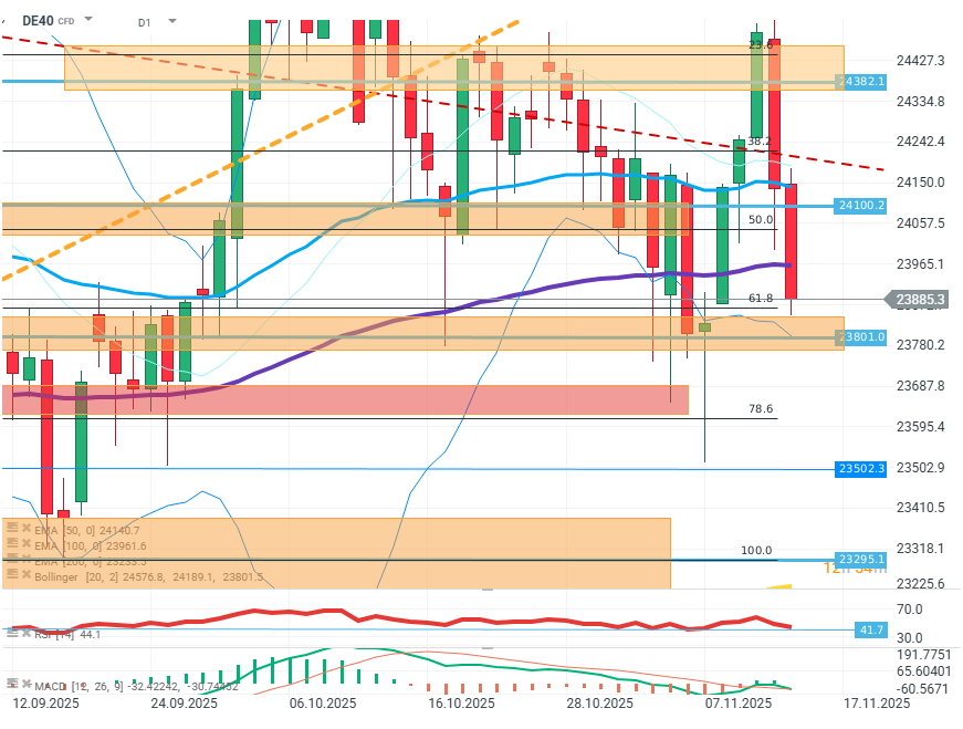 The last session of the week brings a deepening of declines on the European market. Recent comments from the FOMC in the USA have dashed market hopes for rate cuts in December, which is reverberating across global markets. The leaders of declines in Europe are Poland and Germany. DAX40 contracts are losing over 1%. Slightly less, but also down by about 0.7%, are the prices of SPA35, ITA40, and UK100 contracts. The French stock market is doing better, with CAC40 down by about 0.4%. Switzerland is on a slight positive at the halfway point of the session.