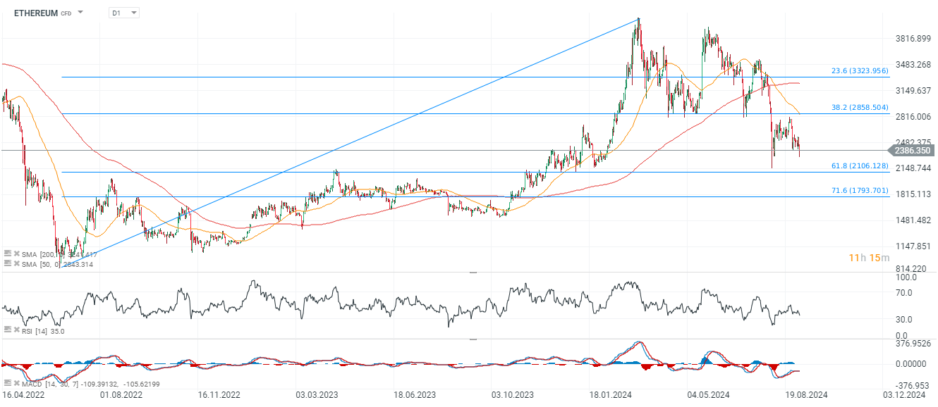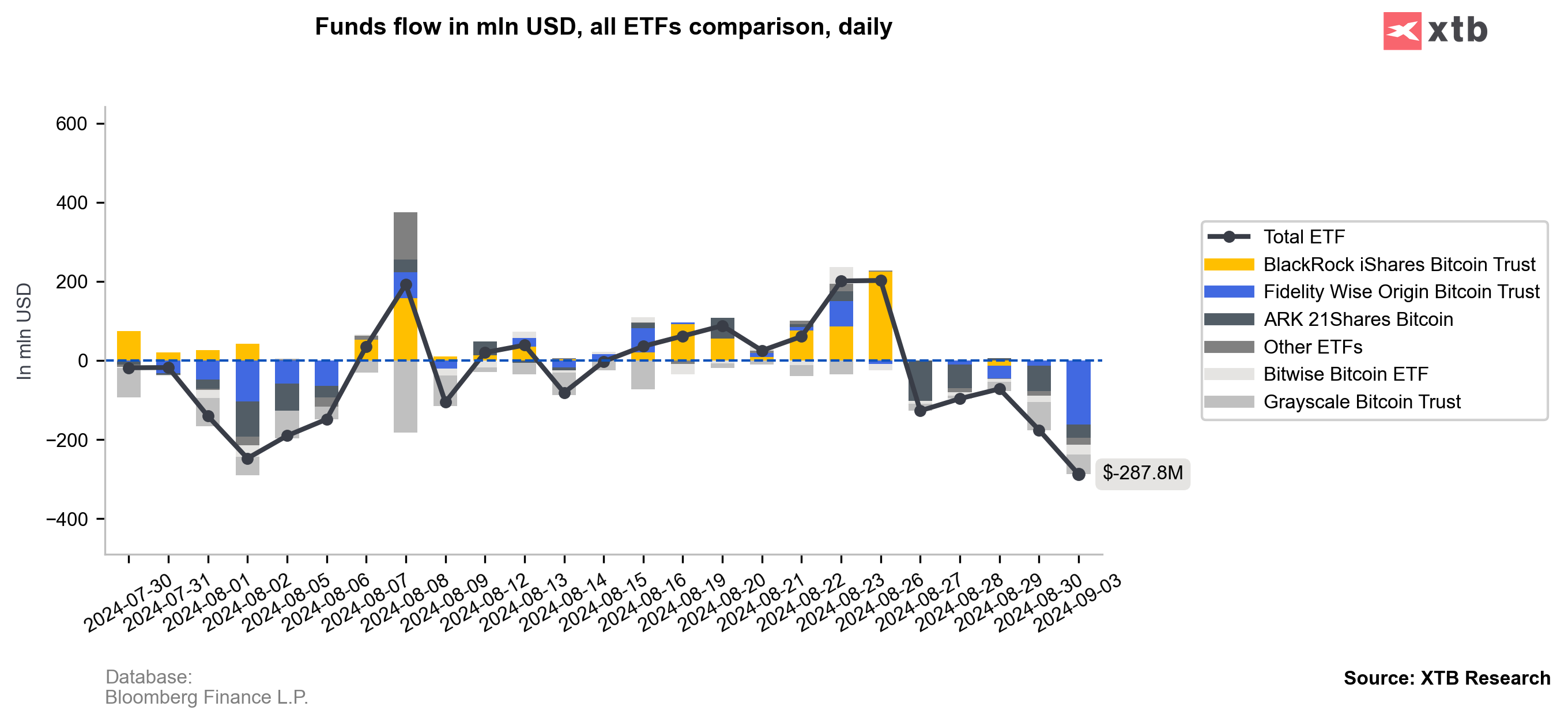 - Yesterday, Ethereum ETFs recorded net outflows, selling nearly 18,000 ETH. We also observe weaker sentiment in the Bitcoin market, which has fallen below $57,000, alongside a weakening dollar and a drop in the yield on 10-year U.S. Treasury bonds to around 3.8%, following weaker-than-expected U.S. ISM manufacturing data for August. Bitfinex analysts expect that the first Fed rate cut in September could trigger a sell-off of Bitcoin by as much as 20%, down to $45,000-$40,000.