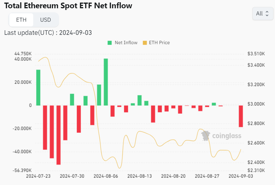 Net outflows for Ethereum have been observed almost continuously since mid-August. Source: CoinGlass