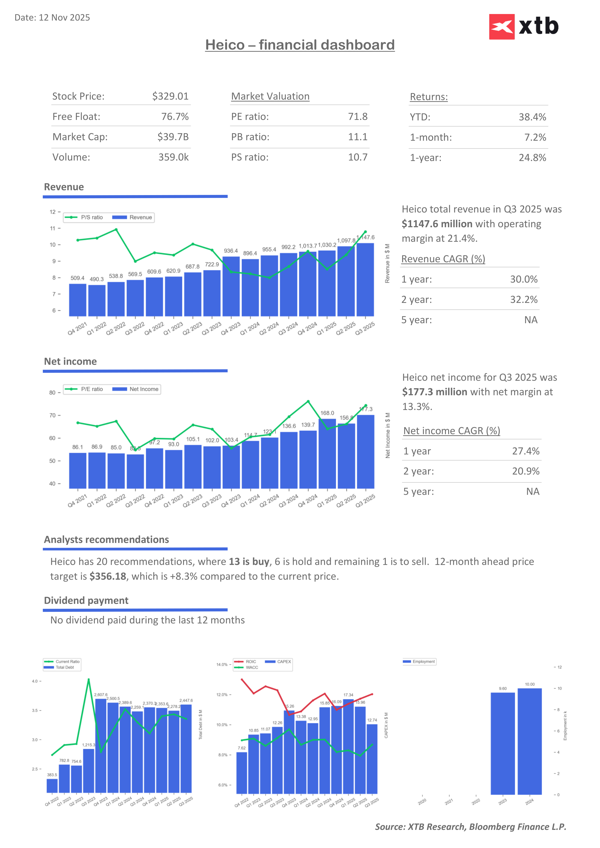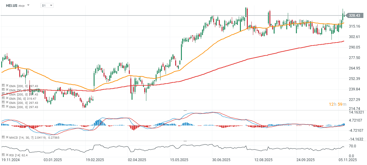 HEICO Corporation (HEI.US) shares are near all-time high zone amid a new, announced acquisition that strengthens its presence in aerospace and defense manufacturing. HEICO’s Electronic Technologies Group has agreed to acquire Axillon Aerospace’s Fuel Containment Business for an undisclosed cash amount. The deal is expected to close in Q1 2026, pending customary conditions, including Hart-Scott-Rodino Antitrust clearance. HEICO expects the purchase to be accretive to earnings within one year after completion. HEICO focuses on advanced parts producing, niche electronics for both commercial and aerospace sectors working with private airlines, Department of Defense and NASA. Last acquisition came in July 2025 (Gables Engineering).