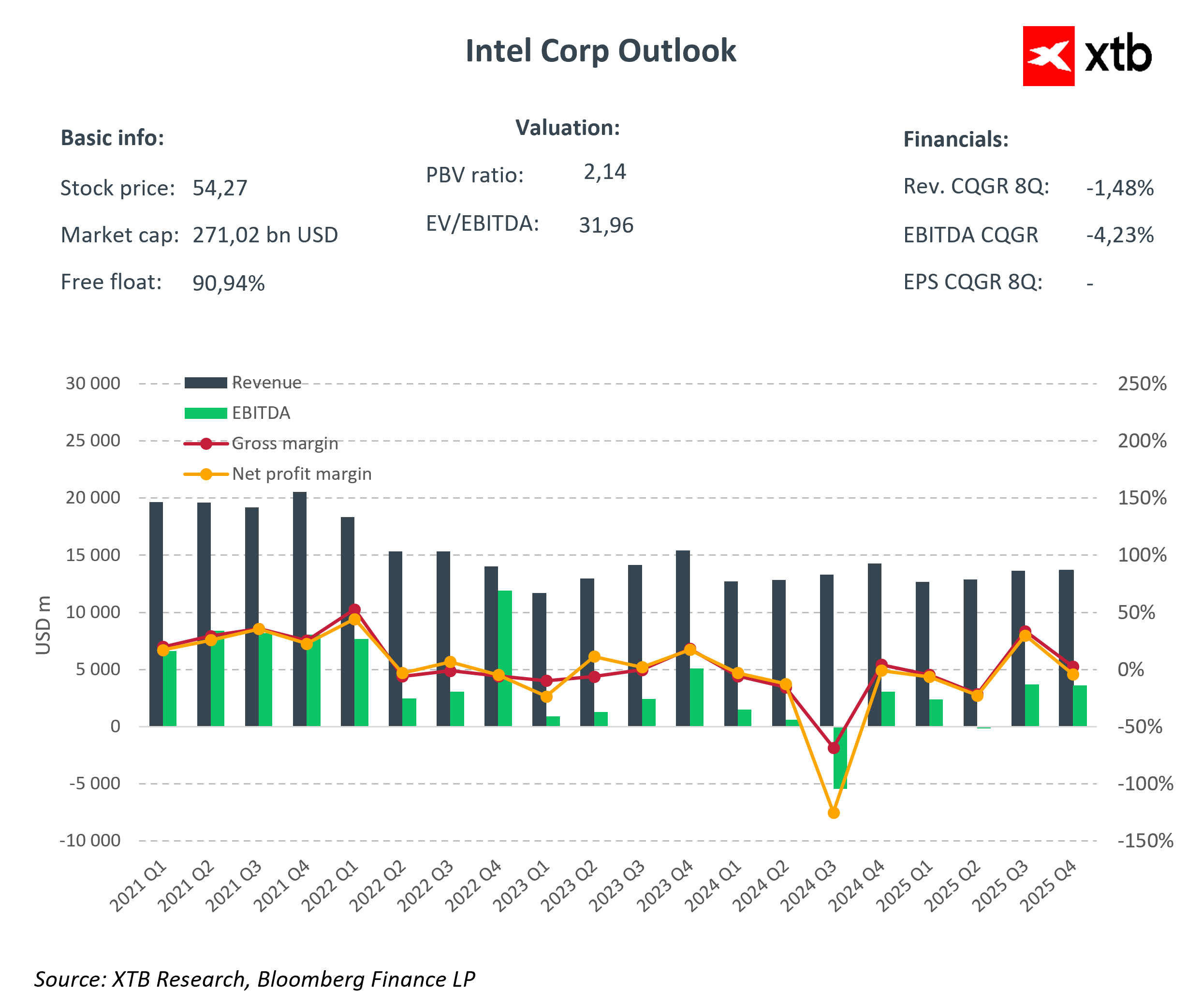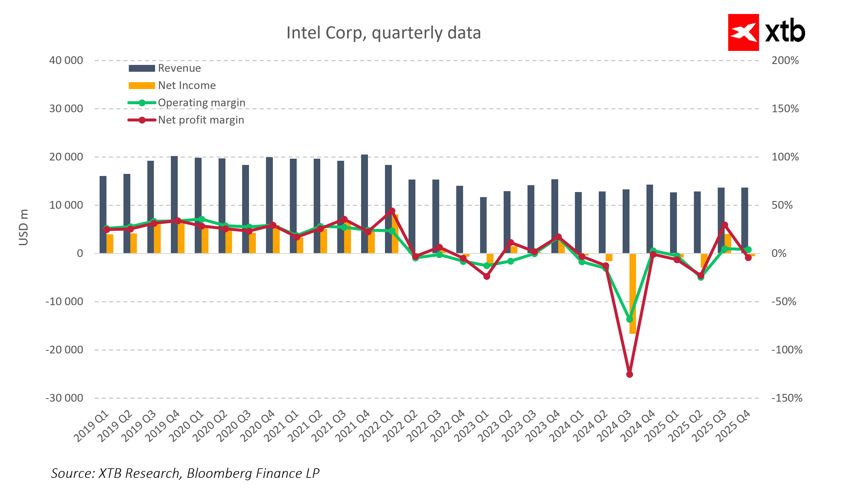 Intel reported results for the fourth quarter of 2025, which at first glance appear solid. The company’s revenue reached USD 13.7 billion, exceeding analyst consensus by 2.2%. Adjusted earnings per share (EPS) came in at USD 0.15, nearly double the expected USD 0.08. The Data Center and AI segment grew 9% year-over-year, reaching USD 4.7 billion, reflecting the growing demand for processors in the era of artificial intelligence.