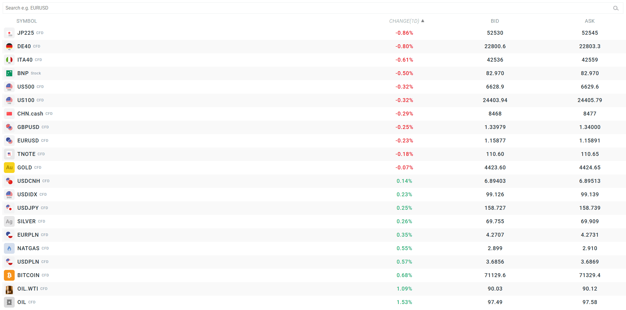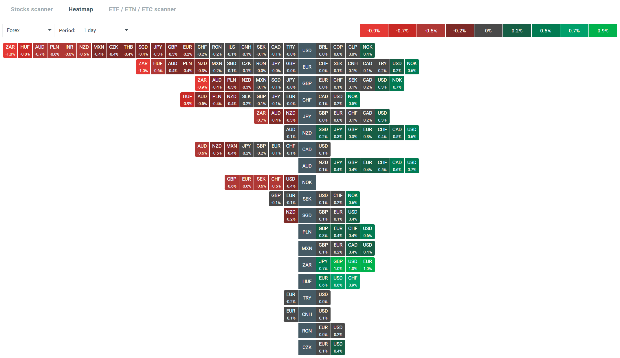 - The USDIDX dollar index is up 0.23%, with currencies from the Southern Hemisphere once again performing the worst, losing 0.67% (AUDUSD) and 0.55% (NZDUSD) against the USD, respectively.