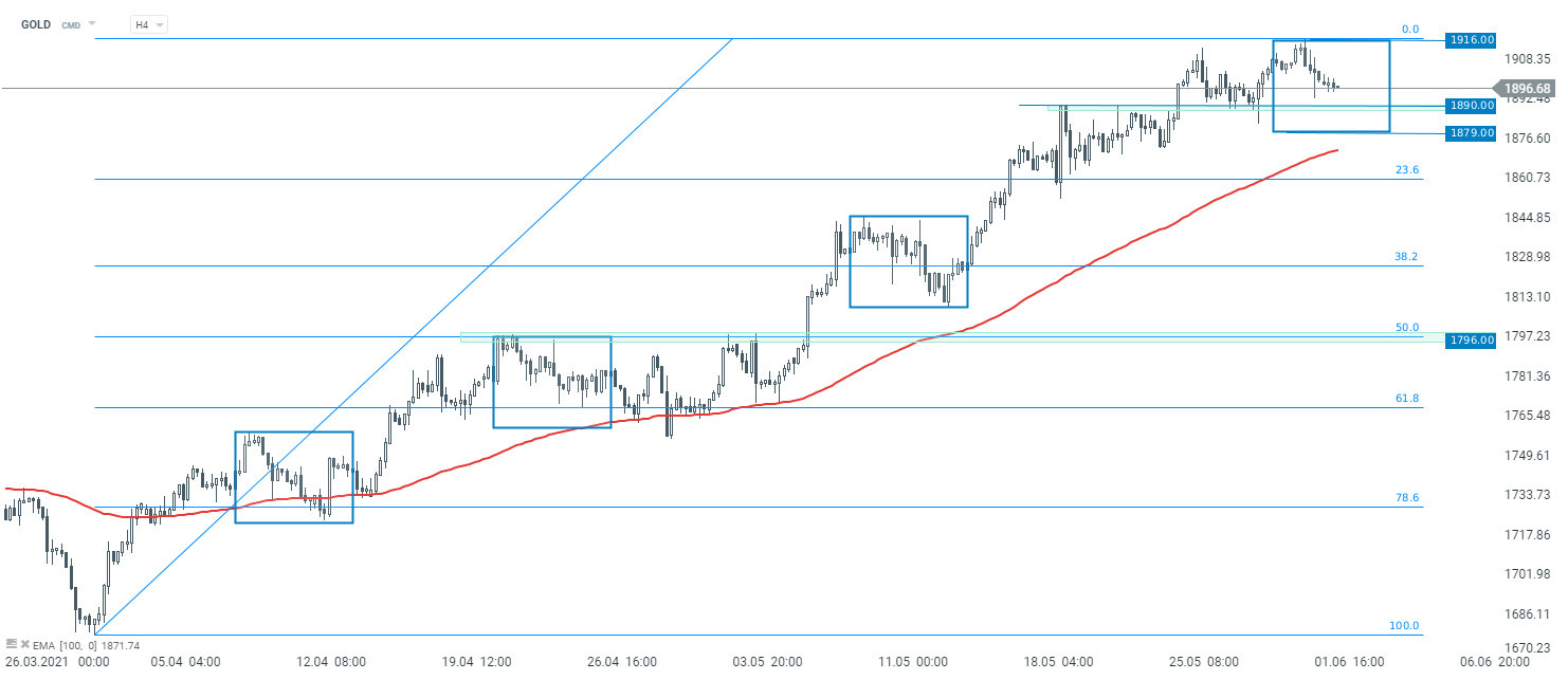 Gold has been in an uptrend since the beginning of April. In recent days, the upward movement has slightly decreased, but it is definitely too early to think about a change of direction. It is worth noting that the first Fibonacci measurement - 23.6% is relatively far away, which proves the strength of the trend (shallow corrections and strong upward impulses). The nearest support is the sequence zone at $ 1,890, followed by the $ 1,879 level, which is marked with the lower limit of the 1:1 structure. The aforementioned Fibo levels should also be considered as support levels. The closest resistance lies at $1,916.