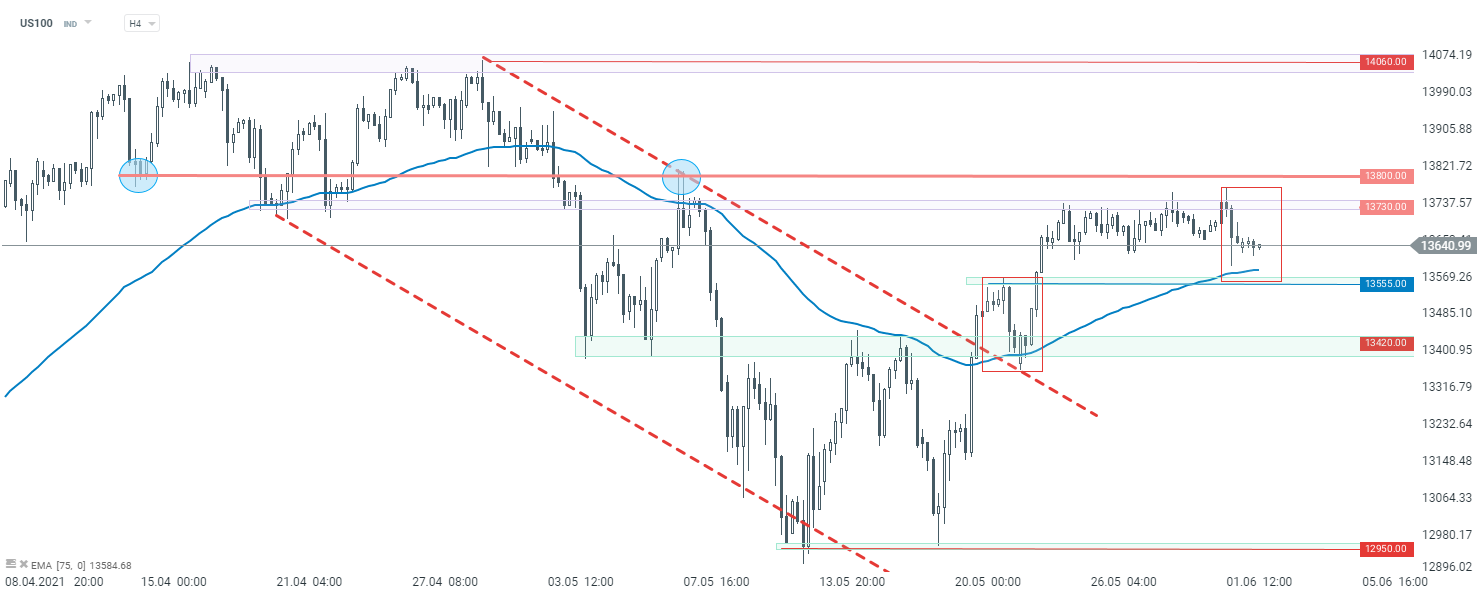 Looking at the stock market, the US Nasdaq (US100) has been consolidating for a week. Buyers tried unsuccessfully several times to break above the resistance at 13,730 pts. If the correction deepens, then it is worth paying attention to the support at 13555 pts, which is marked with the lower limit of the 1: 1 structure and EMA75. Break below this zone could open the way towards support at 13,420 pts. On the other hand, if buyers manage to break above the aforementioned resistance at 13,730 pts at the next attempt, then upward movement may become stronger. In such a scenario, the next noteworthy resistance lies quite close - at 13,800 pts. Breaking above it could pave the way towards all-time highs at 14060 pts.