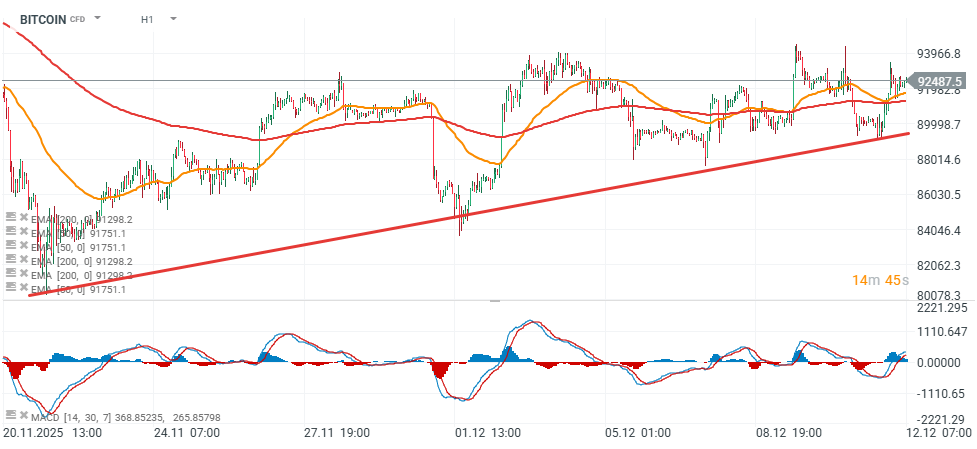 Bitcoin remains in a narrow range around USD 92,500, signaling an ongoing struggle between demand and supply in a key zone. Despite record highs in U.S. equities, Bitcoin has failed to sustainably break above the USD 94,000 area.