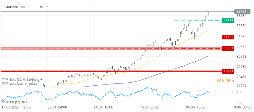 Nikkei 225 (JAP225) reached new peak at 33630 points, H4 interval, source: xStation 5