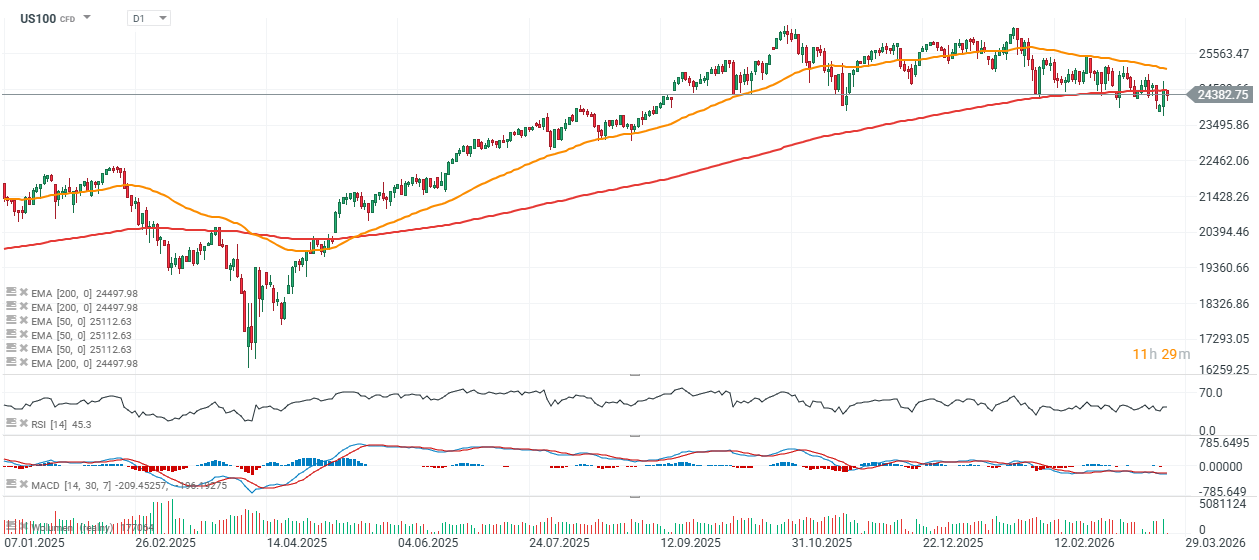 The technical outlook for US100 appears to be deteriorating. If buyers fail to push the index above the 200-session EMA (red line, 24,500 points), selling pressure may increase, potentially dragging the index down toward the 23,000 level.