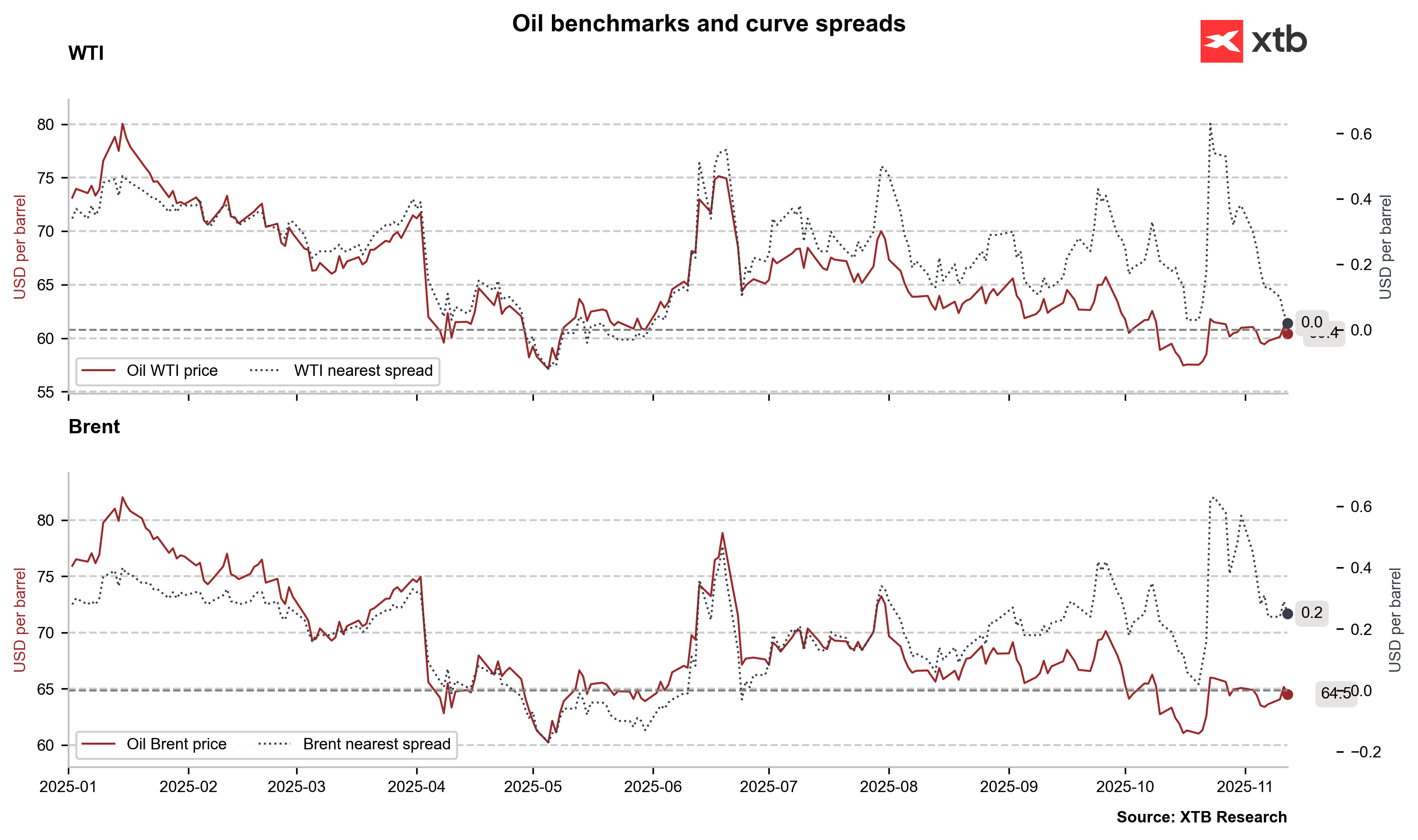 In the futures market, the number of net long positions on WTI oil continues to decline and remains at local lows. Much larger net long positioning can be observed on Brent oil.