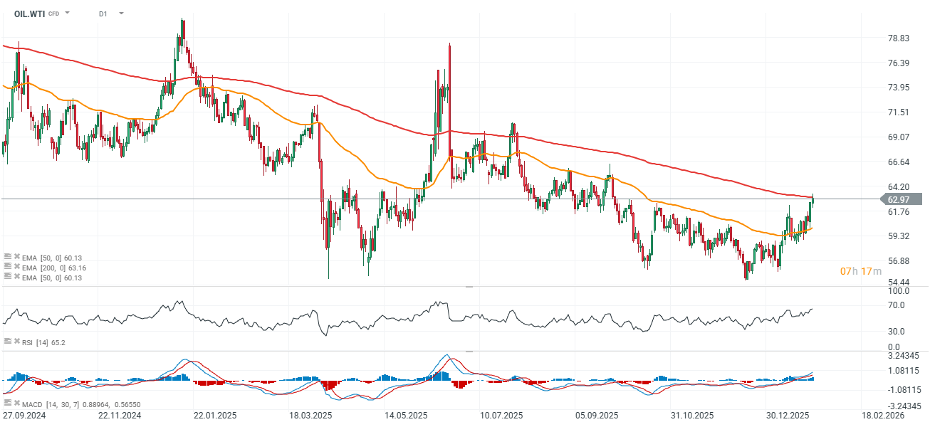West-Texas Intermediate oil prices are rising today amid geopolitical tensions and much lower than expected inventories change (also gasoline inventories) reported by EIA. As we can see below, OIL.WTI approaches EMA200 (the red line) level, trying to reverse the downtrend.