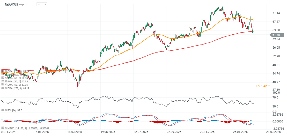 Ryanair shares are experiencing a strong decline and have fallen below the long-term EMA200 moving average (red line). The last time the stock dropped below this level was in April 2025, when the correction eventually reached nearly 30% relative to the moving average. Key support levels now appear to be around USD 60 per share, followed by USD 55, where previous price reactions occurred.
