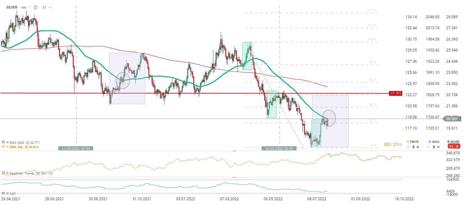 Silver is currently testing a very important area. This is the 50-day moving average and the range of the largest correction in the trend. Silver is already above the retracement of 23.6 of the last downward wave, but at the same time we are observing a resistance zone associated with the local low from May.