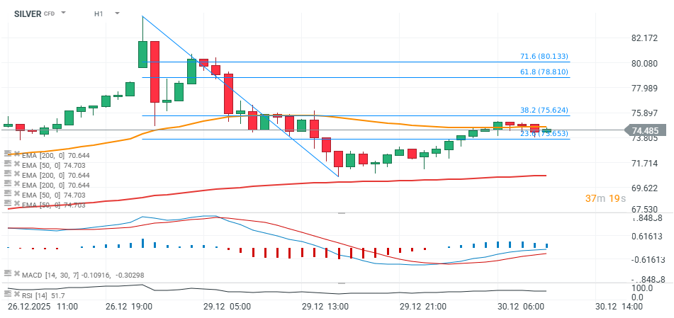 Silver is gradually recovering today after yesterday’s biggest crash in many years, during which prices plunged from nearly $84 per ounce to around $70.5. The metal is now trading near $74, while the hourly RSI has climbed above 50, suggesting that short-term selling pressure may be fading. Price is consolidating between the 23.6% and 38.2% Fibonacci retracement levels of the latest upswing.