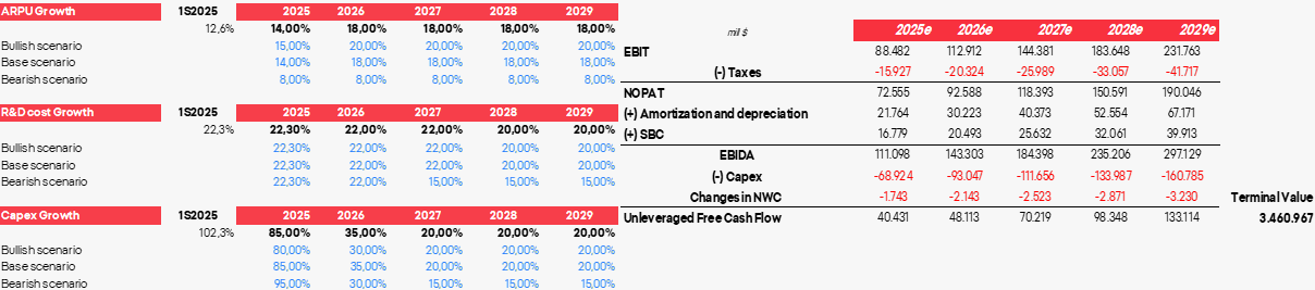 For our valuation, we developed three scenarios based on the three key variables: ARPU, R&D expenditure, and capex. The base case reasonably reflects Meta's new AI-powered developments, which will increase impressions, the potential for market share capture from marketing agencies, and increased profitability for advertisers. Furthermore, the company is beginning to monetize WhatsApp, and we believe it will continue to expand that market. We have also assumed that RL revenues will remain constant despite increased costs.