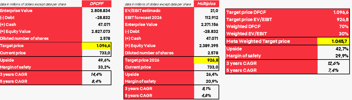 The optimistic scenario gives us a target price of $1,232.7, which represents a potential upside of 68%. Meanwhile, the pessimistic scenario gives us a target price of $561.3, which would give a downside potential of -23%.