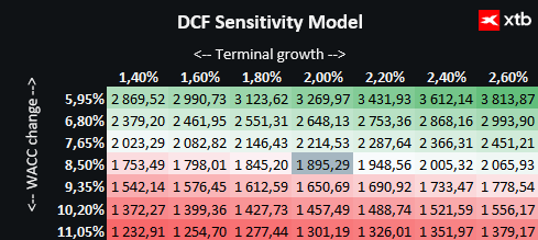 The DCF-based valuation indicates a fair value per share of 1,895 euros, while the current price is 1,565.50 euros, reflecting an upside potential of approximately 21 percent. This highlights the company’s strong fundamentals, growing margins, and ability to generate cash in the Defence segment.